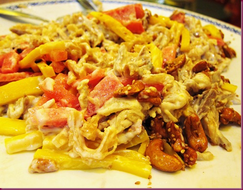 IMG_0163Duck and Jellyfish Salad – it’s supposed to look prettier than this, but the waiter tossed the salad before I could take a photo. This duck-jellyfish-mango-watermelon-cashew-nut combo is not photogenic, but please don’t be put off. This is good stuff.